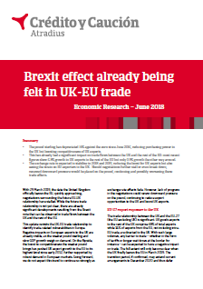 Num contexto de estagnação nas negociações entre a União Europeia e o Reino Unido sobre a saída do Brexit, o último relatório da Crédito y Caución alerta para os efeitos que o longo processo já está a ter no comércio. Desde junho de 2016, a libra esterlina desvalorizou 14% face ao euro, o que reduziu o poder de compra dos britânicos para importar, mas aumentou a competitividade das suas exportações. A fraqueza da libra impulsionou o crescimento das exportações do Reino Unido para a UE ao seu nível mais alto desde 2011, apoiado pela forte procura nos mercados europeus. Os números mais recentes mostram um crescimento de 6,8% nas exportações do Reino Unido para o resto da União, em comparação com um crescimento de 0,9% no sentido oposto.