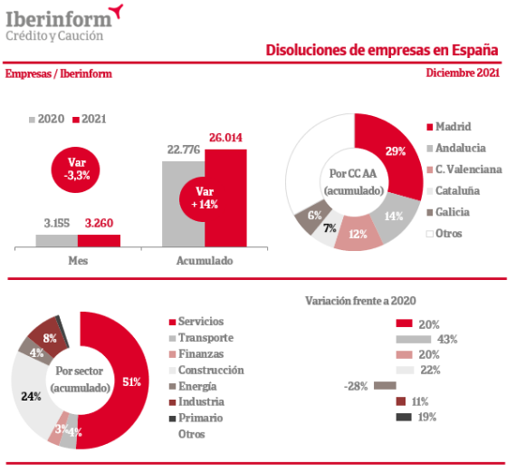 Las disoluciones de empresas muestran un crecimiento acumulado durante los once primeros meses de 2021 del 14%. Madrid (29% del total de casos), Andalucía (14%) y la Comunidad Valenciana (12%) son las Comunidades Autónomas donde más disoluciones se declaran. Les siguen Cataluña (7%) y Galicia (6%). Por sectores, predominan las disoluciones de compañías dedicadas a servicios (51% del total) y construcción (24%), seguidas de la industria manufacturera (8%).
