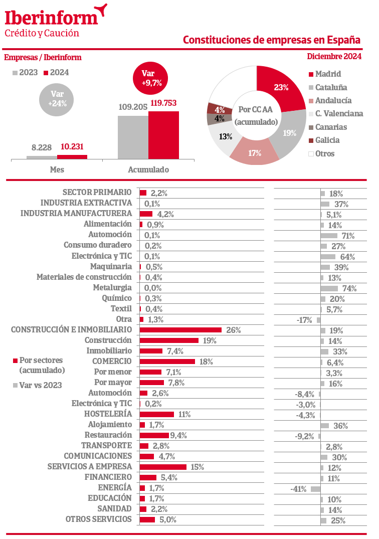 De acuerdo con el seguimiento de los registros mercantiles que realiza Iberinform, la constitución de nuevas empresas registró en diciembre un aumento del 24% respecto al mismo mes del ejercicio anterior. En el conjunto del año la creación de tejido productivo acumula una subida del 9,7%. Las nuevas firmas se concentran en Madrid (23% del total), Cataluña (19%), Andalucía (17%) y la Comunidad Valenciana (13%). Por sectores de actividad, las constituciones se concentran en construcción e inmobiliario (26% del total), seguidas de comercio (18%), servicios a empresa (15%) y hostelería (11%).