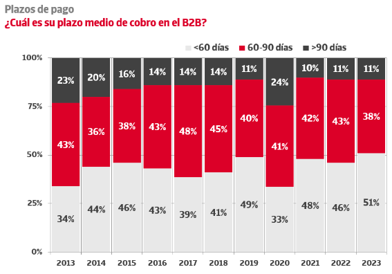 De acuerdo con el Estudio de la Gestión del Riesgo de Crédito en España, que impulsan Crédito y Caución e Iberinform, en 2023 los plazos de pago se han estabilizado en valores muy similares a los de 2022 y 2021, cuando los estímulos fiscales y las inyecciones extraordinarias de liquidez al tejido productivo devolvieron los plazos de las ventas a crédito en el B2B a niveles pre Covid-19. En marzo de 2020, coincidiendo con la declaración de la pandemia, las medidas de distanciamiento social y el cierre temporal de la actividad productiva, los plazos de pago mostraron el peor comportamiento de toda la serie histórica del Estudio.