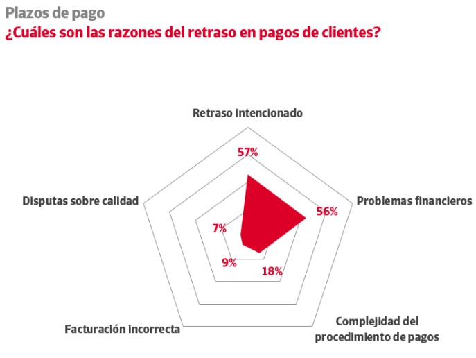 La complejidad del procedimiento de pagos (18%), la emisión de facturas incorrectas (9%) o las disputas sobre la calidad de los bienes y servicios suministrados (7%) siguen estando entre las principales razones del retraso en los pagos.