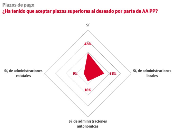 Aunque en menor medida, las Administraciones también forman parte del problema de la extensión indeseada de los plazos de pago: el 48% de las empresas que trabaja con el sector público tiene que aceptar plazos superiores a los deseados, tres puntos por encima a los niveles registrados en 2024. El peor comportamiento, que afecta al 38% de las empresas, se da entre las Administraciones locales. Este porcentaje se reduce en las Administraciones autonómicas (18%) y en las estatales (9%), a medida que desciende el nivel de competencias atribuidas a cada institución.