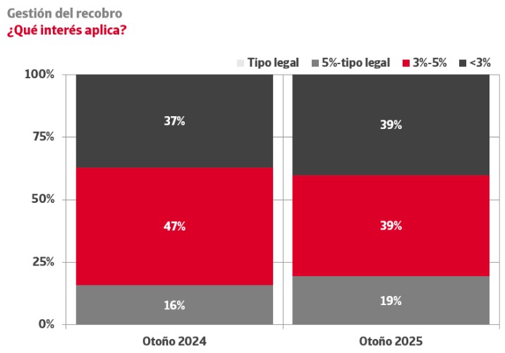 Cuando se inician las acciones de recobro, la inmensa mayoría de las empresas renuncia al cobro de intereses de demora. El 63% de las empresas no los aplica nunca y solo el 4% es sistemático a la hora de ejercer su derecho. Son niveles peores a los registrados hace un año, lo que indica el esfuerzo que están realizando las compañías por mantener la relación con sus clientes, a pesar del retraso en el pago.