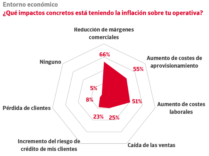 Una vía para compensar estos aumentos de costes pasa por incrementar los precios finales para proteger los márgenes comerciales. Sin embargo, dicha estrategia es arriesgada, debido a factores como la reducción del poder adquisitivo de los clientes o la elasticidad de la demanda. Según el estudio, el contexto de contención de la demanda está obligando al 66% del tejido empresarial a absorber el impacto de los nuevos costes, lo que implica una pérdida de rentabilidad y una reducción de sus márgenes comerciales.
