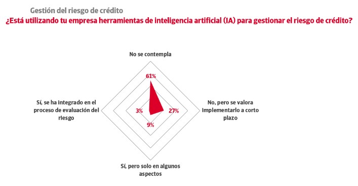 La Inteligencia Artificial permite procesar grandes volúmenes de datos históricos y en tiempo real para anticipar escenarios financieros como caídas de ingresos o impagos, ayudando a anticipar, mitigar y responder de forma más ágil a los desafíos económicos. Sin embargo, el Estudio de Gestión del Riesgo de la oleada de otoño refleja la reticencia de las empresas a incorporar herramientas de IA en la gestión del riesgo de crédito ya que sólo el 3% de las casi 800 empresas consultadas asegura haberlo incorporado en los procesos de evaluación. Un 27% de las entidades empresariales señala su intención de emplear la IA en el corto plazo mientras que el 61% no considera el uso de esta tecnología en la gestión del riesgo crediticio.