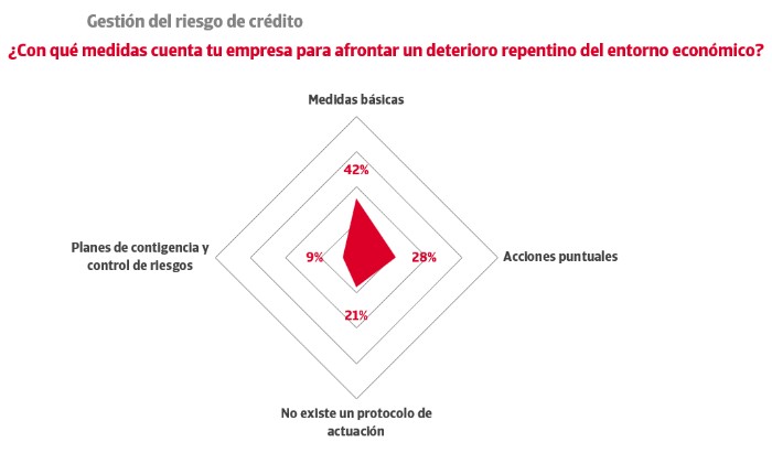 La consulta realizada a cerca de 800 gestores de empresa refleja que el 21% de las compañías no tiene preparada ningún tipo de estrategia frente un cambio negativo en el contexto comercial y económico, lo que aflora la vulnerabilidad en la gestión del riesgo. Por su parte, el 42% de las empresas afirma contar con medidas básicas y el 28% con acciones puntuales para poder contrarrestar cambios negativos en la economía.