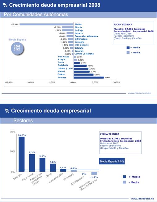 Así, los últimos datos públicos disponibles del Registro Mercantil [RM] referidos al ejercicio 2008 ya indicaban esta tendencia. En base al análisis que ha realizado Iberinform de las cuentas de más de 80.000 empresas españolas, la deuda creció únicamente un 0,9%, muy por debajo de lo que lo había hecho en los últimos años. Esta situación de cambio de tendencia en los niveles de deuda empresariales `hace aún más necesario para las empresas disponer de información sobre clientes y proveedores que ayude a anticipar su evolución y su impacto en el negocio´, según Andrés Ohlsson, Director General de Iberinform. Datos por Comunidades Autónomas y sectores Los datos por Comunidades Autónomas presentan grandes diferencias. Las empresas situadas en Asturias, Galicia, Madrid, Castilla y León, Andalucía, Ceuta, Aragón y País Vasco han visto crecer su deuda, aunque las dos últimas por debajo de la media. El resto de Comunidades Autónomas ha visto descender su deuda en menos de un 3% [excepto Melilla, con un -12%]. En cuanto a datos sectoriales, únicamente las empresas del sector Industria presentan un descenso en sus niveles de deuda. Los sectores con incremento superior a la media los encontramos en Construcción [1,4%], Otros [3,8%], Agricultura [6,5%], Financiero [8,3%] y Energía [16,5%]. |