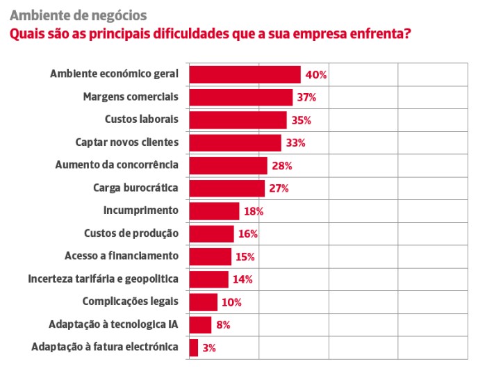 Note-se que 18% das empresas colocam o impacto dos atrasos de pagamento entre as suas principais preocupações e 15% afirmam ter dificuldades em obter financiamento, o que mostra sinais de vulnerabilidade em termos de liquidez. Por outro lado, 14% identificam a incerteza tarifária e as tensões geopolíticas como um dos principais desafios.