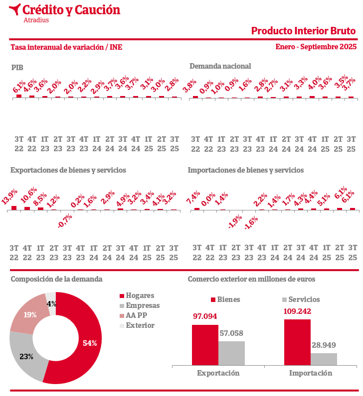 Según los datos del INE, en el segundo trimestre de 2018, el Producto Interior Bruto de España registra una variación interanual del 2,7%.