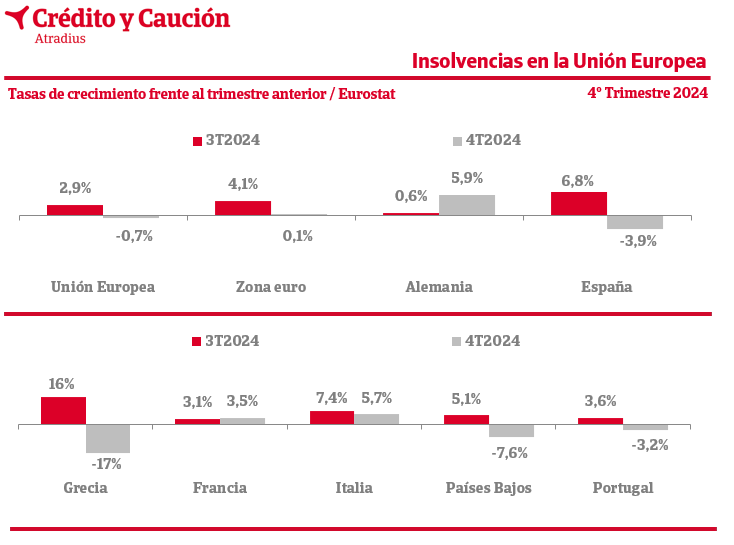 De acuerdo con las últimas estimaciones de Eurostat, en el cuarto trimestre de 2024 las insolvencias decrecieron un 0,7% en la Unión Europea y crecieron un 0,1% en la zona euro frente al trimestre anterior.