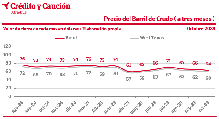 Los precios del barril Brent y West Texas cierran en 64 y 60 dólares, respectivamente, en octubre de 2025.