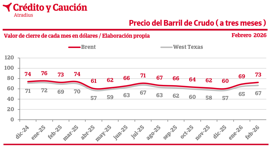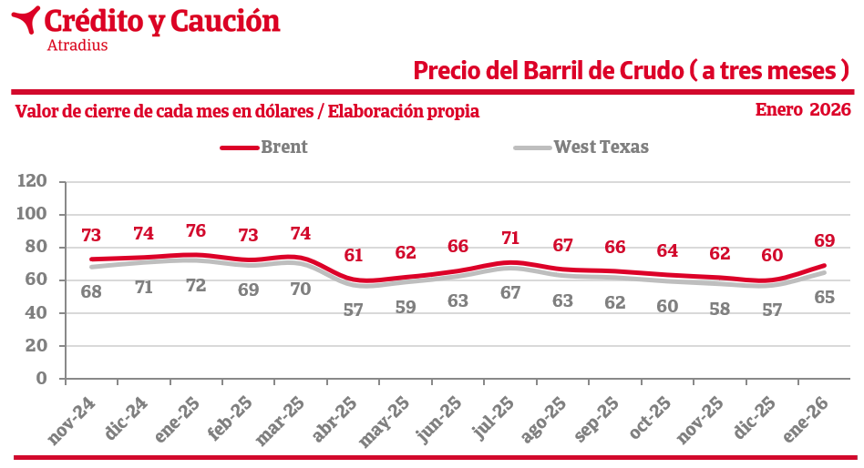 Los precios del barril Brent y West Texas cierran en 69 y 65 dólares, respectivamente, en enero de 2026.
