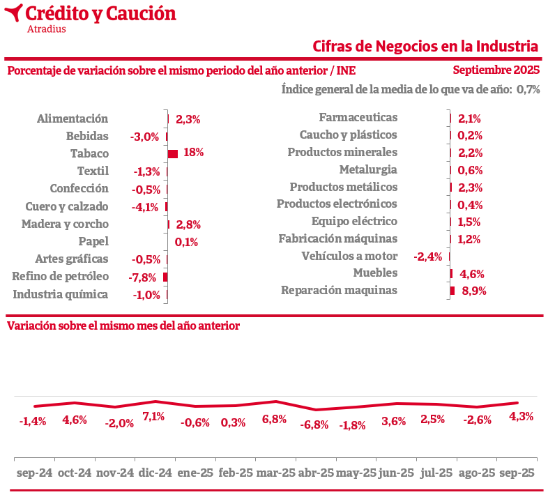La cifra de negocios de la industria en septiembre de 2025 en España crece un 0,7% interanual, según los datos del INE.