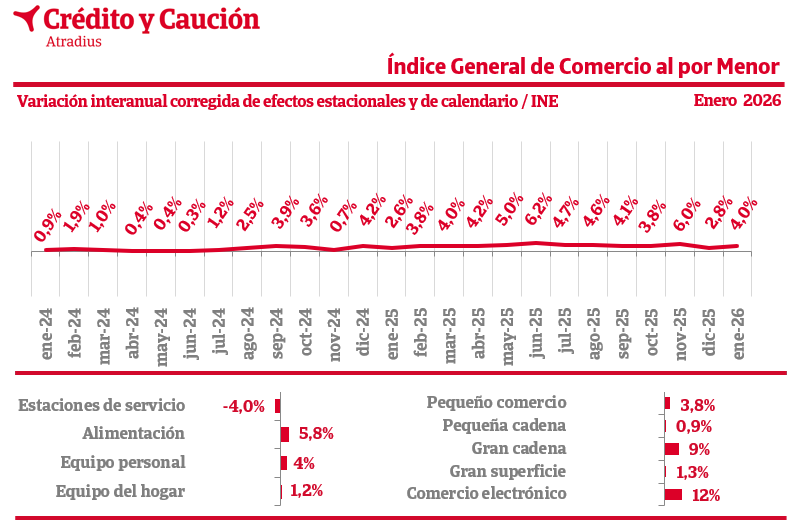 Según los datos del INE, el comercio minorista creció un 4% en enero respecto al mismo mes de 2025.