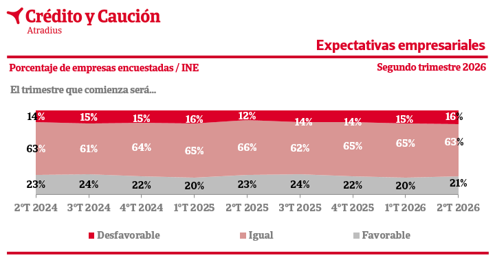 El 21% de las empresas españolas considera que la marcha de su negocio será favorable en el segundo trimestre de 2026 según el INE.