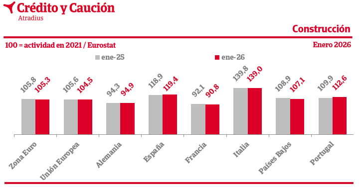 20 de abril 2026, datos de Construcción en la Unión Europea, referente al mes de febrero de 2026, (Eurostat).