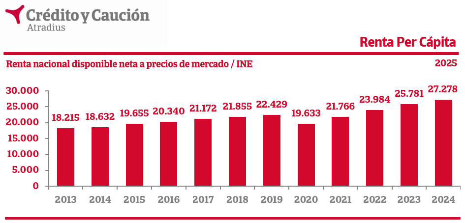 Según los últimos datos de la Contabilidad Nacional Anual, la renta per cápita en España aumentó hasta los 27.278 euros anuales.