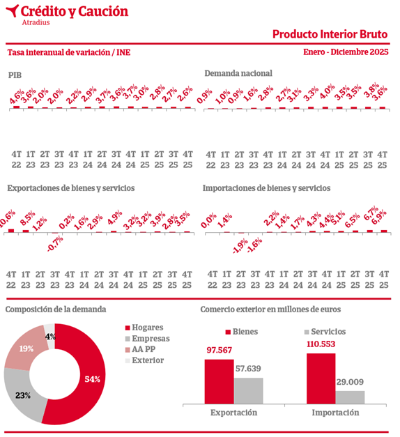 Según los datos del INE, en el cuarto trimestre de 2025, el Producto Interior Bruto de España registra una variación interanual del 2,6%.