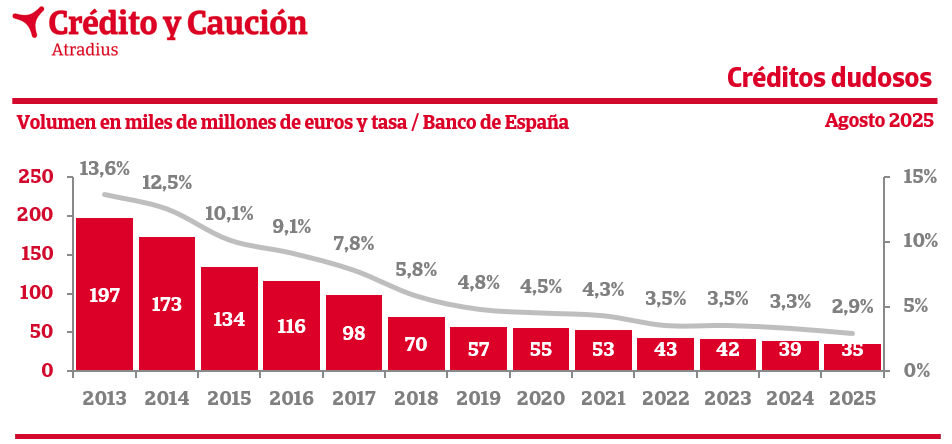 Según los datos provisionales extraídos por Crédito y Caución del último Boletín Estadístico que mensualmente publica el Banco de España, en el mes de agosto de 2025, el volumen de créditos de dudoso cobro sumaba 35.378 millones de euros, lo que situó la tasa de morosidad bancaria en el 2,9% del total de crédito concedido.