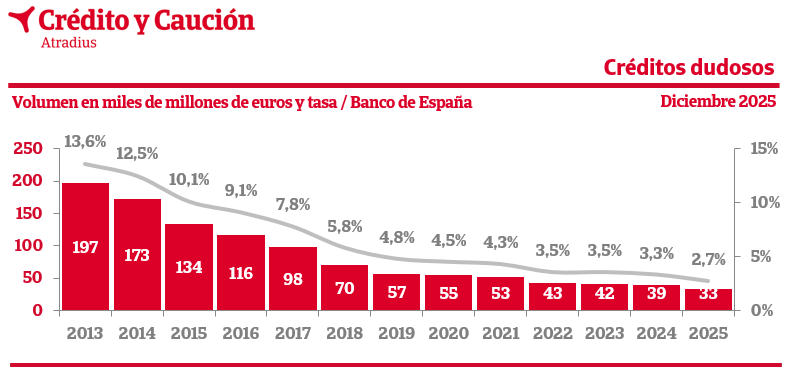 Según los datos provisionales extraídos por Crédito y Caución del último Boletín Estadístico que mensualmente publica el Banco de España, en el mes de diciembre de 2025, el volumen de créditos de dudoso cobro sumaba 33.329 millones de euros, lo que situó la tasa de morosidad bancaria en el 2,7% del total de crédito concedido.