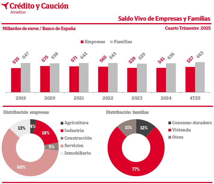En el cuarto trimestre de 2025, el saldo vivo de préstamos a empresas y hogares se situó en 1.227.725 millones de euros, según el Banco de España.