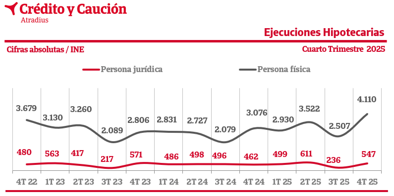 Según los datos del INE, en el cuarto trimestre de 2025, las ejecuciones hipotecarias a familias iniciadas e inscritas en los registros de la propiedad suben un 33% en tasa anual.