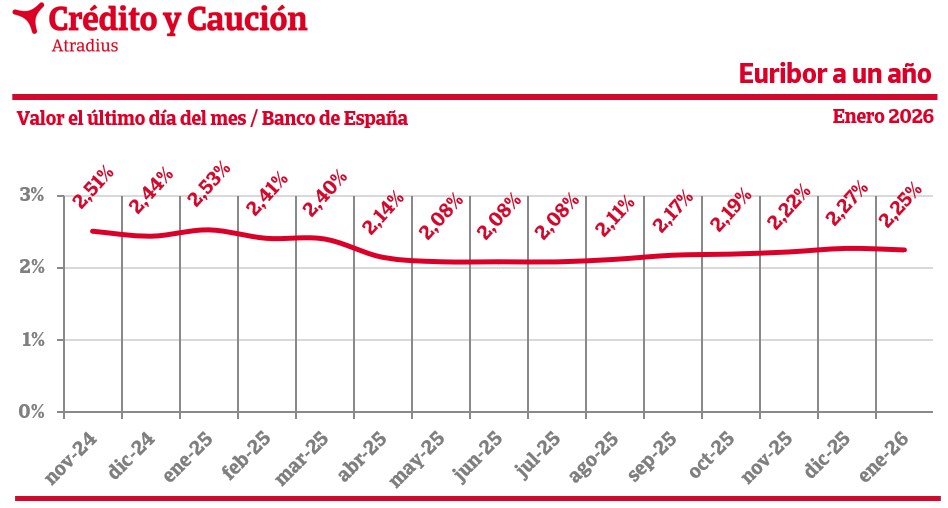 El Banco de España confirma que el Euríbor a 12 meses, referencia en la mayoría de préstamos hipotecarios a tipo variable en España, bajó en enero al 2,245%.
