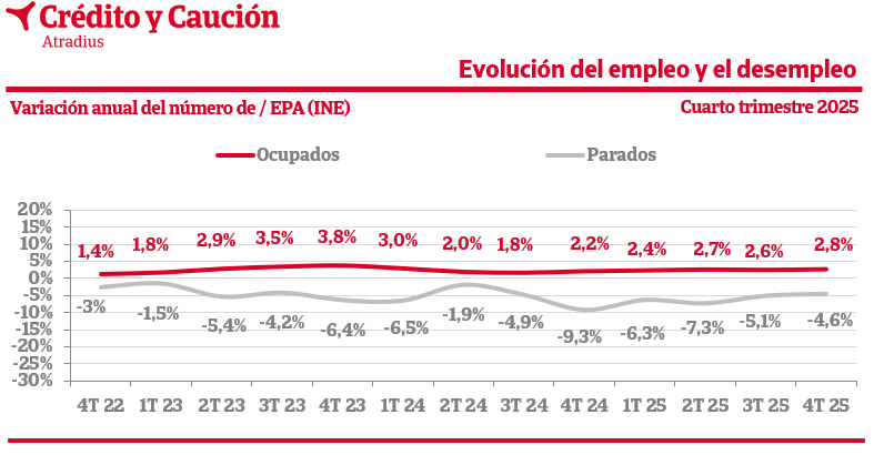 Los datos del cuarto trimestre de 2025 de la Encuesta de Población Activa (EPA) muestran un ligero aumento interanual del número de ocupados.