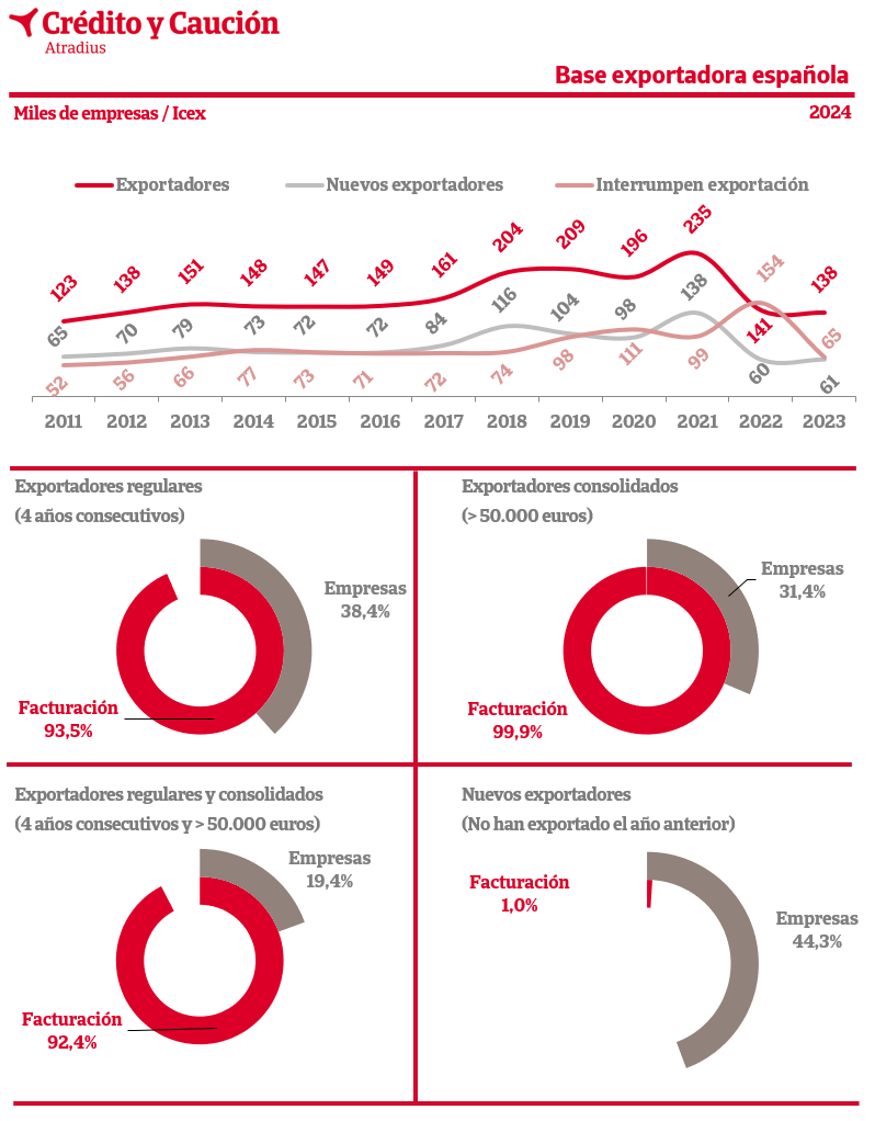 El 92% de las exportaciones se concentró en el 19% de las empresas consideradas exportadores regulares (un mínimo de cuatro años continuados de exportación) y consolidados (un mínimo de 50.000 euros de exportaciones anuales). El crecimiento interanual de este segmento fue del 2,3%.