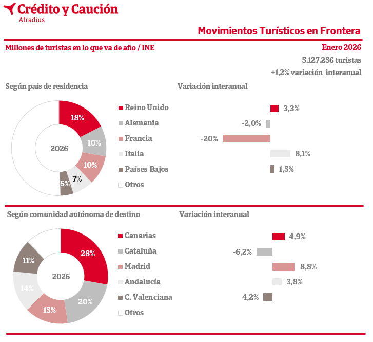 En enero, España recibió un 1,2% más de turistas internacionales que en el mismo periodo de 2025, según los datos de la Encuesta de Movimientos Turísticos en Frontera.