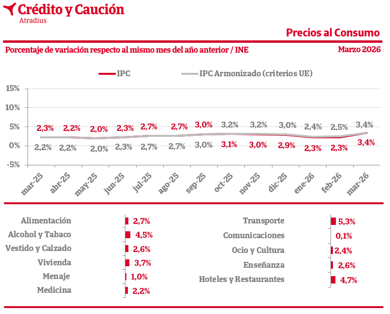 En marzo de 2026, el Índice de Precios de Consumo español (IPC) se sitúa en el 3,4% interanual, según los datos del INE. Los alimentos crecen al 2,7%.