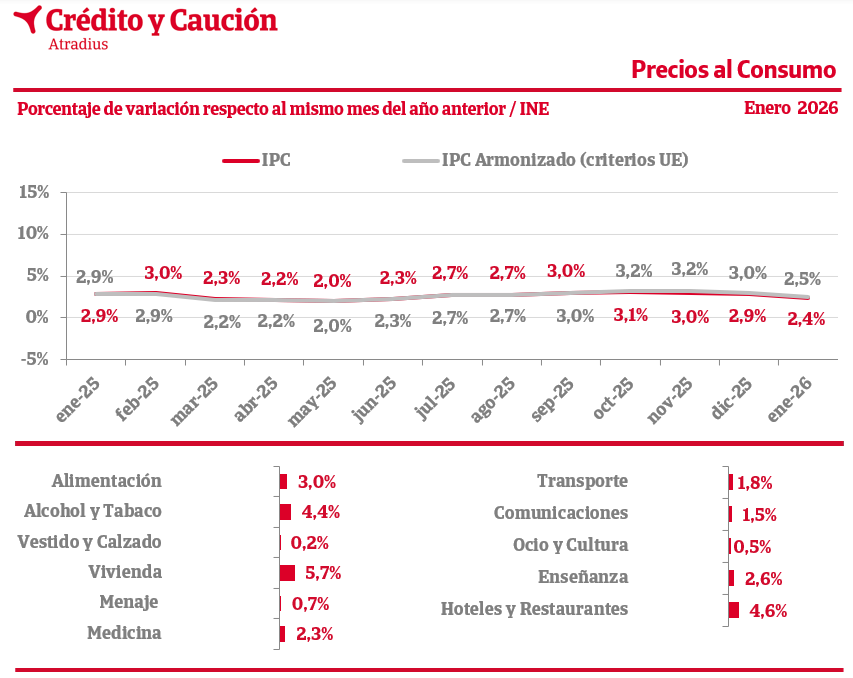 En enero de 2026, el Índice de Precios de Consumo español (IPC) se sitúa en el 2,4% interanual, según los datos adelantados del INE.