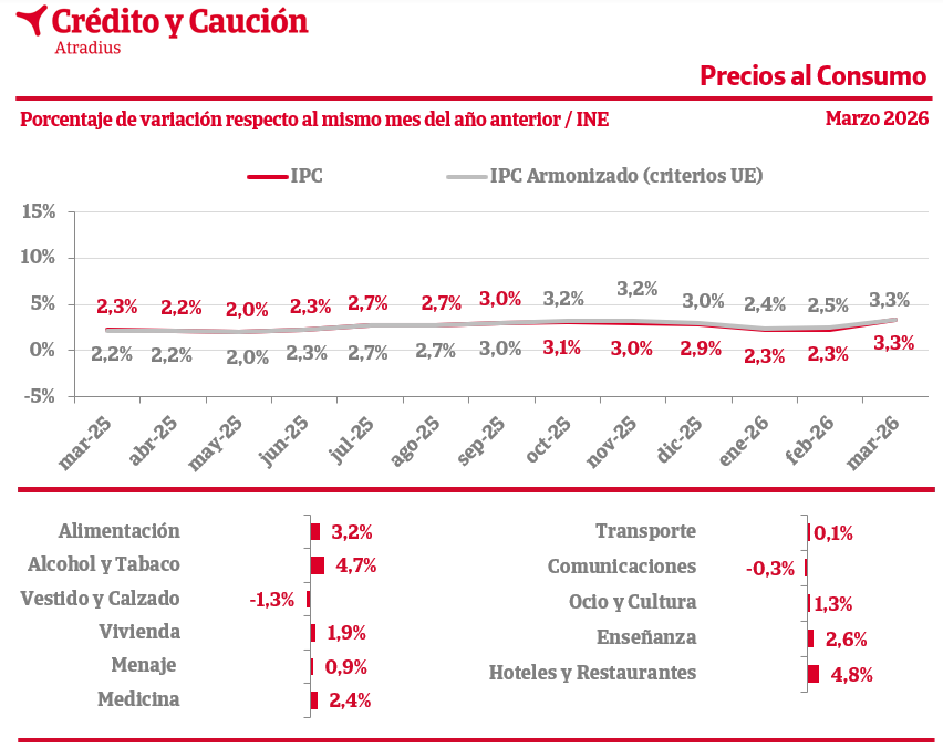 En marzo de 2026, el Índice de Precios de Consumo español (IPC) se sitúa en el 3,3 interanual, según los datos adelantados del INE.