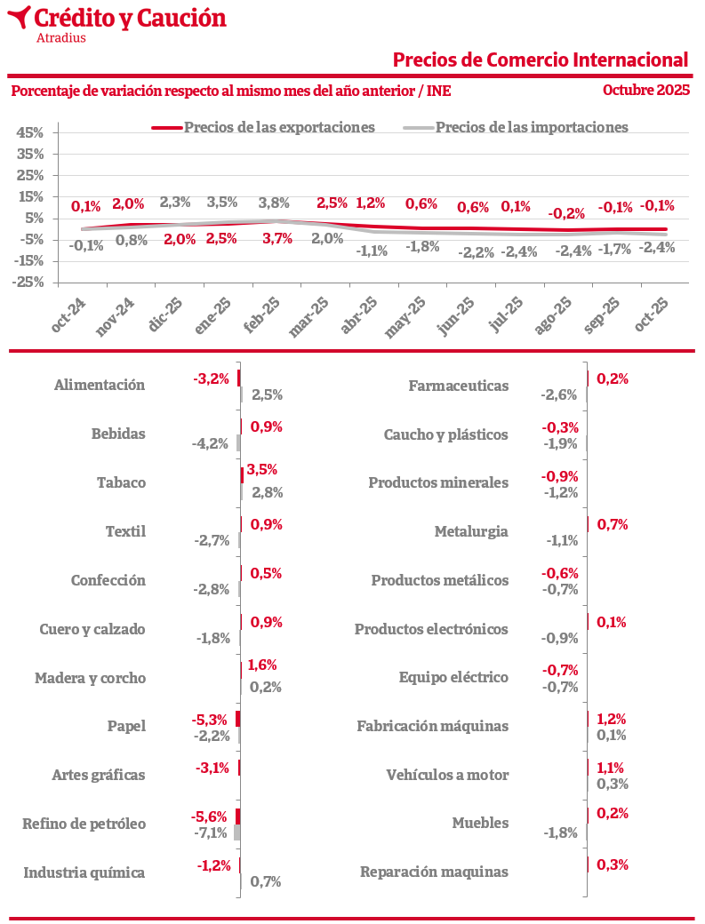 29 de diciembre de 2025, datos de octubre de 2025 del Índice de Precios de Exportación y de Importación de Productos Industriales, (INE).