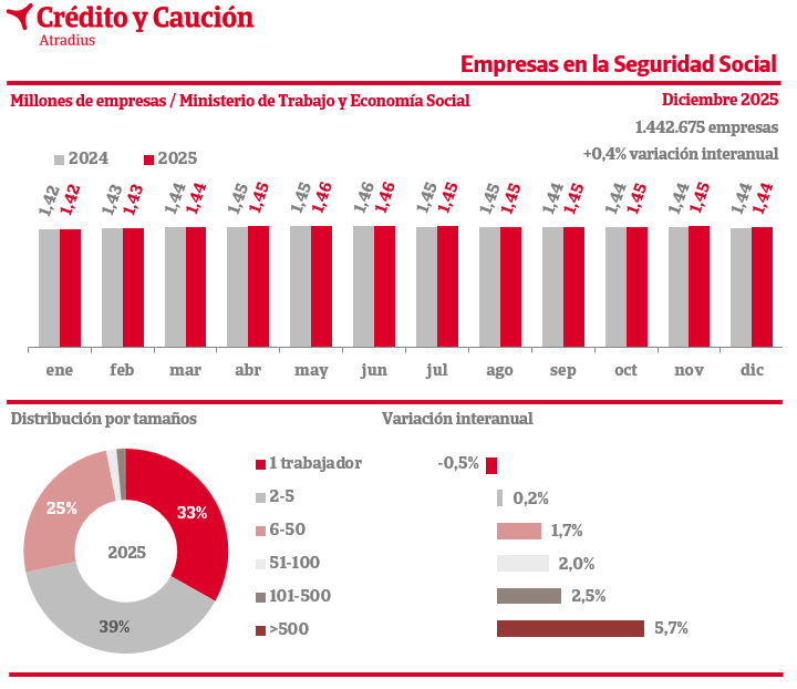 Según los datos de cotización del Ministerio de Trabajo, el número de empresas activas en diciembre de 2025 varió un 0,4% frente a los valores de hace un año.