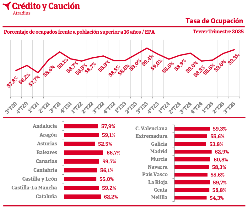 Según los últimos datos de la Encuesta de Población Activa (EPA), en el tercer trimestre de 2025, la tasa de ocupación aumentó hasta el 59%.