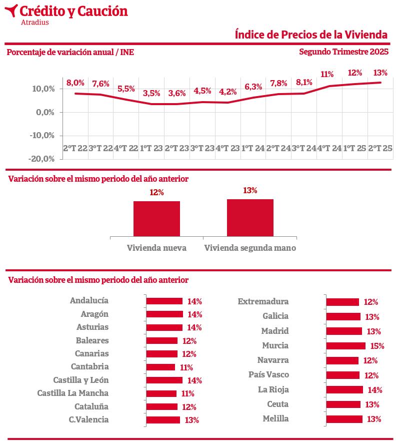 Según el INE, en el segundo trimestre de 2025, el Índice de Precios de Vivienda aumenta un 13%. La vivienda de segunda mano crece un 13% y la nueva, un 12%.