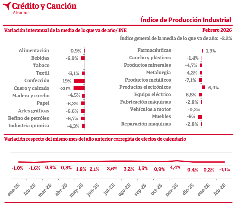 El Índice de Producción Industrial en España, decreció un 2,2% interanual en febrero, según los datos del INE.