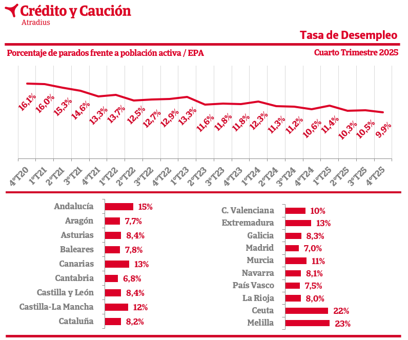 Según los últimos datos de la Encuesta de Población Activa (EPA), en el cuarto trimestre de 2025, la tasa de desempleo disminuyó hasta el 9,9%.