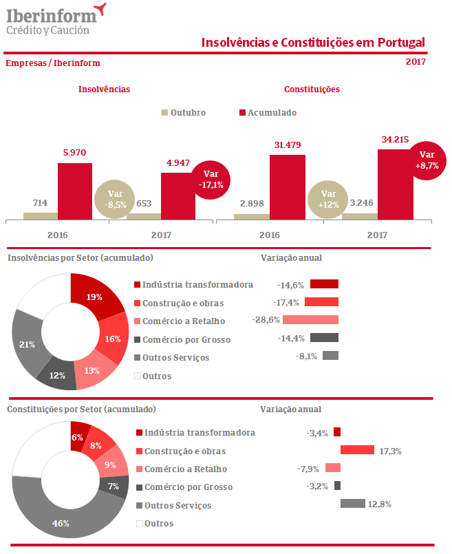 Em termos absolutos, em outubro, há registo de 653 insolvências, menos 61 que no mês homólogo de 2016. No acumulado, são 4.947 as empresas insolventes (menos 1.023 que em 2016). Lisboa e Porto são os distritos com valores absolutos de insolvências mais elevados, 1.421 e 1.001 respetivamente. Contudo, em relação a 2016, estes números traduzem diminuições de 2,6% em Lisboa e uma redução significativa de 23,4% no Porto. Os decréscimos de insolvências mais significativos verificam-se em Angra do Heroísmo (menos 68%), Beja (diminuição de 62%), Coimbra (menos 44%) e Évora (quebra de 40%). A Madeira mantém-se em contra ciclo com um aumento de 8,7% no número de empresas insolventes.