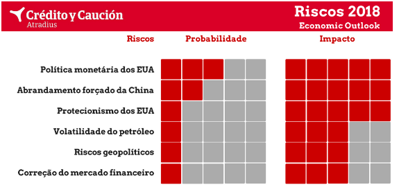 Quais os principais riscos que vão ameaçar a robustez do crescimento e do comércio global em 2018? De acordo com o mais recente Economic Outlook, divulgado pela Crédito y Caución, a lista é encabeçada pelas políticas monetárias dos Estados Unidos. Embora o "nosso cenário de referência seja uma política de ajuste bem orientada e direcionada pela Reserva Federal" existe uma probabilidade moderada de que o crescimento das taxas de juros leve a que "os fluxos de capital se afastem das economias emergentes", o que teria um forte impacto na economia global. "Dificultaria o acesso financeiro e as oportunidades de crescimento. Nesse cenário, empresas, famílias e governos em todo o mundo enfrentarão custos financeiros mais elevados", explica o relatório.