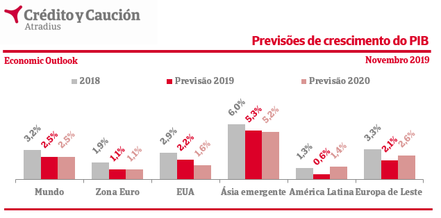 O crescimento económico mundial desacelera e fragiliza-se cada vez mais. Esse é o alerta da Crédito y Caución que prevê “uma notável desaceleração” do PIB mundial para 2,5% em 2019 e 2020, sete décimas abaixo do valor de 2018, em resultado do abrandamento das trocas comerciais provocado pela guerra comercial entre EUA e China. O comércio mundial está a abrandar e a incerteza reduz o investimento empresarial. A estabilidade do consumo das famílias na América do Norte e na Europa, que se mantém graças aos mercados de trabalho historicamente fortes, será a chave do crescimento em 2020.
