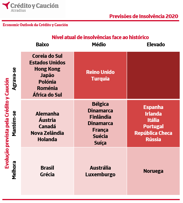 Por países, um em cada três enfrentará a deterioração das condições de insolvência no próximo ano. Os maiores aumentos são esperados no Reino Unido e em Hong Kong (7%), seguidos de perto pela Turquia, Singapura e Roménia (5%). Num plano considerado estável (limitado a cerca de 2%) encontram-se os países que irão registar um leve aumento e cujo número duplica face aos que esperam uma melhoria. Outro sinal de que o ciclo de insolvências está a mudar é que a maioria dos países com baixos níveis de incumprimento em 2007 enfrentará um aumento das insolvências em 2020.