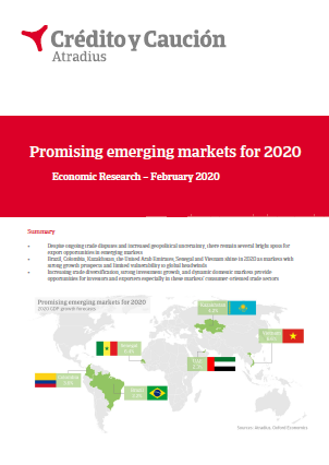 Em 2020, a flexibilização da política monetária deveria ter um efeito estabilizador do crescimento global, acompanhada de uma lenta recuperação do comércio, mas o cenário não está isento de incertezas, como a possibilidade de novas tensões comerciais entre os EUA e a China ou um não-acordo entre o Reino Unido e a União Europeia. Que mercados emergentes se destacam neste contexto? O mais recente relatório da Crédito y Caución destaca seis mercados: Brasil, Colômbia, Cazaquistão, Emirados Árabes Unidos, Senegal e Vietname. São países com crescimentos sustentados do PIB, impulsionados pelo consumo privado e por investimentos fixos, com suficiência de reservas externas, com taxas de cambio flexíveis e estabilidade institucional. “Embora alguns dos países mencionados não sejam os mercados de crescimento mais rápido, são aqueles que apresentam um crescimento estável ou acelerado, a par de condições comerciais favoráveis e de oportunidades de crescimento em vários setores”, salienta o relatório.