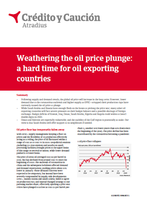 O mais recente relatório da Crédito y Caución prevê um aumento gradual dos preços do petróleo e alerta para os efeitos que os atuais níveis de preços poderiam ter na estabilidade das economias do Golfo Pérsico. Embora a Arábia Saudita e a Rússia ainda tenham margem para prolongar a guerra de preços, outros países exportadores de petróleo enfrentam possíveis desequilíbrios nas suas contas públicas e escassez de divisas. Os défices orçamentais do Kuwait, Iraque, Omã, Arábia Saudita, Argélia e Angola poderiam aproximar-se dos dois dígitos em 2021. Omã e Bahrein são particularmente vulneráveis.