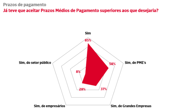 Oitenta e cinco por cento das empresas tem que aceitar prazos de pagamento superiores aos desejados para poder manter a sua carteira de clientes. O estudo revela pior comportamento nas PME do que nas grandes empresas. Trinta e sete por cento das empresas teve que aceitar prazos de pagamento superiores aos desejados por parte de grandes empresas, frente a 58% que teve que alargar os prazos para trabalhar com o segmento de PME. Este comportamento está relacionado com outras evidências reveladas pelo estudo, como o aumento dos problemas de liquidez do tecido empresarial. O melhor comportamento regista-se no setor público. Apenas 8% das empresas que têm relações comerciais com a Administração Pública tem que aceitar uma extensão dos prazos de pagamento. A capacidade dos profissionais liberais para impor prazos de pagamento também se situa nos 28%.