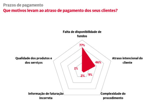 Nesse sentido, ao abordar as razões que explicam a morosidade empresarial, a falta de disponibilidade de fundos (77%) é a razão mais referida, antes do atraso intencional dos clientes (46%). A complexidade dos procedimentos de pagamento (9%), a emissão de faturas incorretas (2%) ou as disputas sobre a qualidade dos bens e serviços fornecidos (1%) completam os motivos apresentados pelos clientes para atrasar os seus pagamentos.