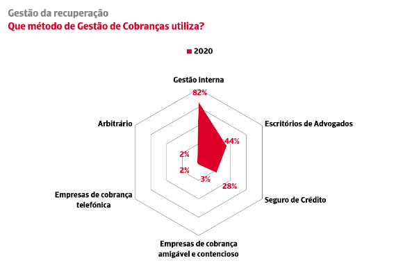 O estudo aborda os métodos de gestão de cobranças utilizadas pelas empresas. O recurso a fornecedores que se limitam à cobrança telefónica (2%) é muito reduzido. A efetividade da externalização da cobrança B2B concentra-se nos escritórios de advogados (44%) e no seguro de crédito (28%).