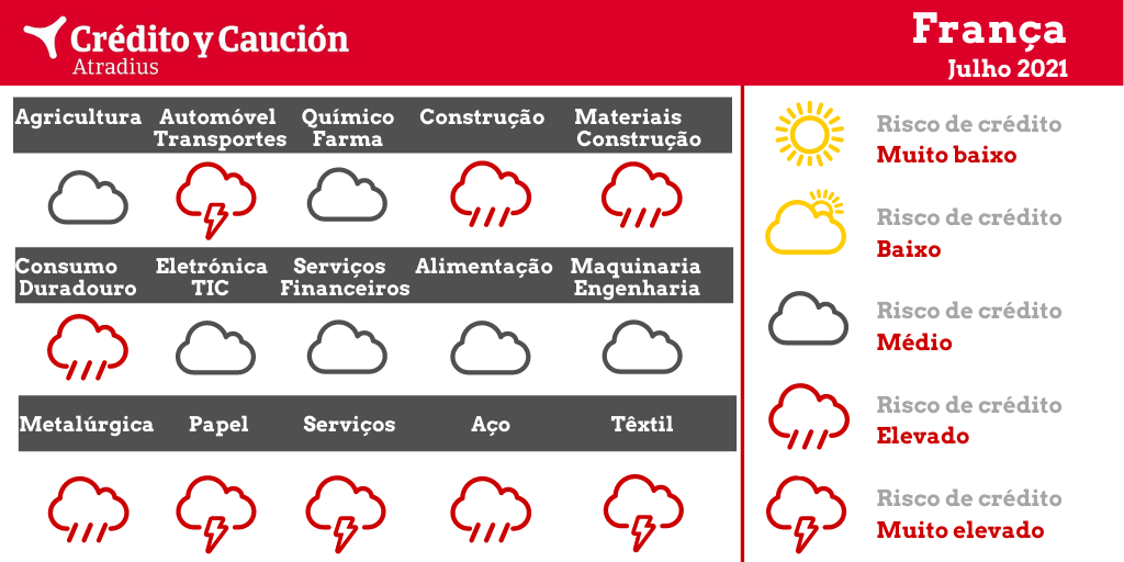 Setores como agricultura, automóvel, bens de consumo duradouro, construção, eletrónica e TIC, financeiro, maquinaria e engenharia, metalurgia e aço, papel, serviços e têxtil apresentam um elevado risco de incumprimento.